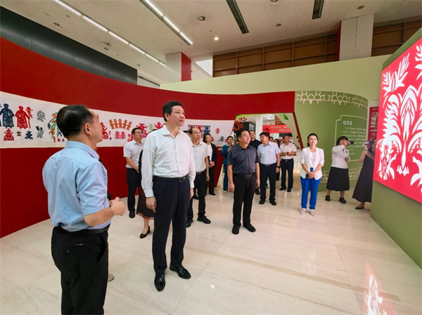 靳國(guó)衛(wèi)在參觀過(guò)程中,仔細(xì)欣賞了各類剪紙作品,并與非遺傳承人親切交流,詳細(xì)了解剪紙技藝的保護(hù)與傳承情況。靳國(guó)衛(wèi)指出,要突出本土剪紙獨(dú)具特色的藝術(shù)價(jià)值,強(qiáng)調(diào)其人與自然和諧相處的內(nèi)涵,展現(xiàn)其貼近人民生活的本質(zhì);要加強(qiáng)宣傳推廣,提升剪紙展及剪紙藝術(shù)的影響力,建立傳承人譜系;要進(jìn)校園設(shè)立剪紙?zhí)厣n程,同時(shí)進(jìn)文化館、企業(yè)、社區(qū)等,推動(dòng)剪紙融入美育教育;要注重實(shí)際運(yùn)用與衍生品開發(fā),擴(kuò)大傳播范圍,以“用”促傳承;要鼓勵(lì)創(chuàng)新融合,推動(dòng)傳統(tǒng)剪紙形式與現(xiàn)代藝術(shù)理念結(jié)合,增強(qiáng)傳播力和接受度;要發(fā)揮帶動(dòng)作用,通過(guò)剪紙藝術(shù)帶動(dòng)群眾學(xué)習(xí)傳承各類非物質(zhì)文化遺產(chǎn),做好相關(guān)培育工作。